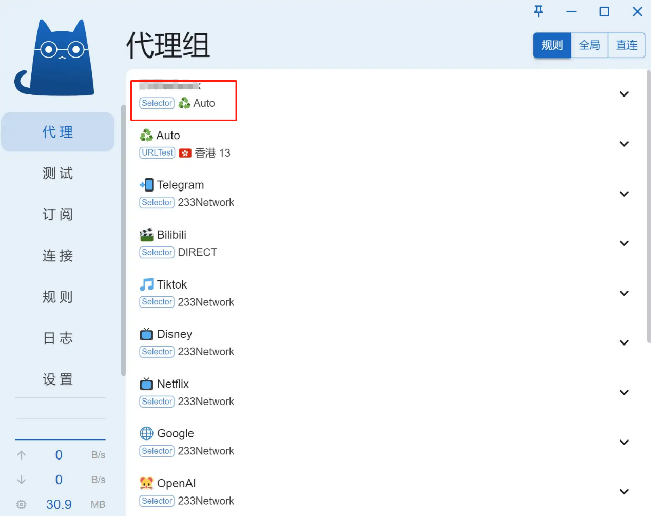 7.回到 Clash Verge 界面,点击左侧的「代理」,选择一个节点。我们的配置文件允许您为某些服务选择单独的节点。